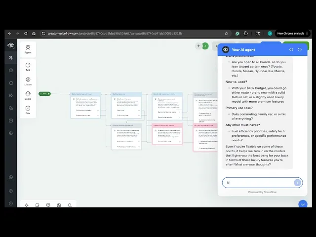 My agent is a personalized car shopping assistant to help customers search, identify, and determine the right vehicle for them. The agent starts off by collecting customer preferences on a type of vehicle that they may be interested in. The prompt states: Start the conversation in a friendly, stylish tone. Ask the customer what type of vehicle they're shopping for (e.g. sedan, SUV, sports car, truck, etc.), any specific brand or feature preferences, their ideal price range, and if there’s a primary use case (e.g. family, work, hobby). It makes it simple, easy, and streamlined for the customer in the car buying market to share their preferences and ideal features in a car, so the agent can make personalized recommendations that fits their user needs.
